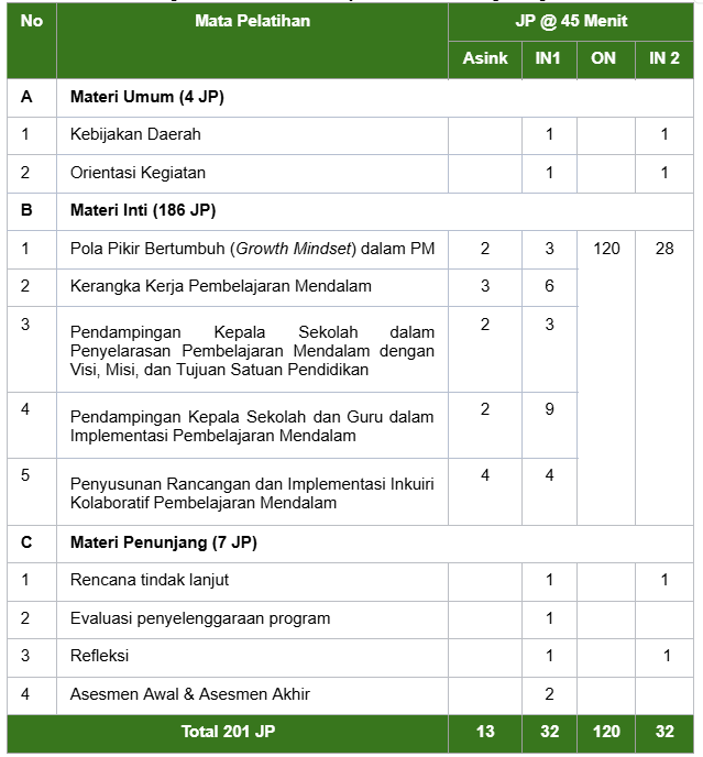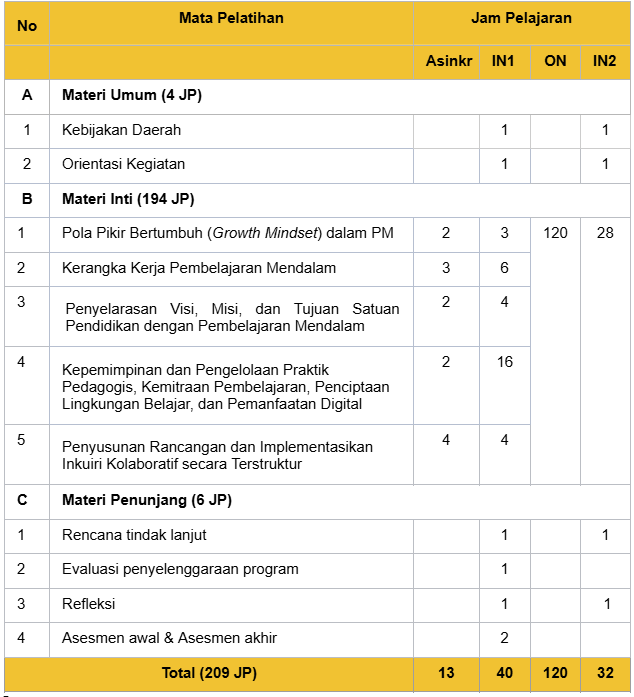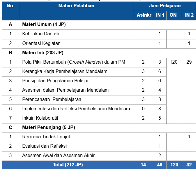 Struktur program yang dikembangkan pada pelatihan pembelajaran mendalam terdiri dari materi umum, materi inti, dan materi penunjang bagi guru, kepala sekolah dan pengawas sekolah sebagai berikut