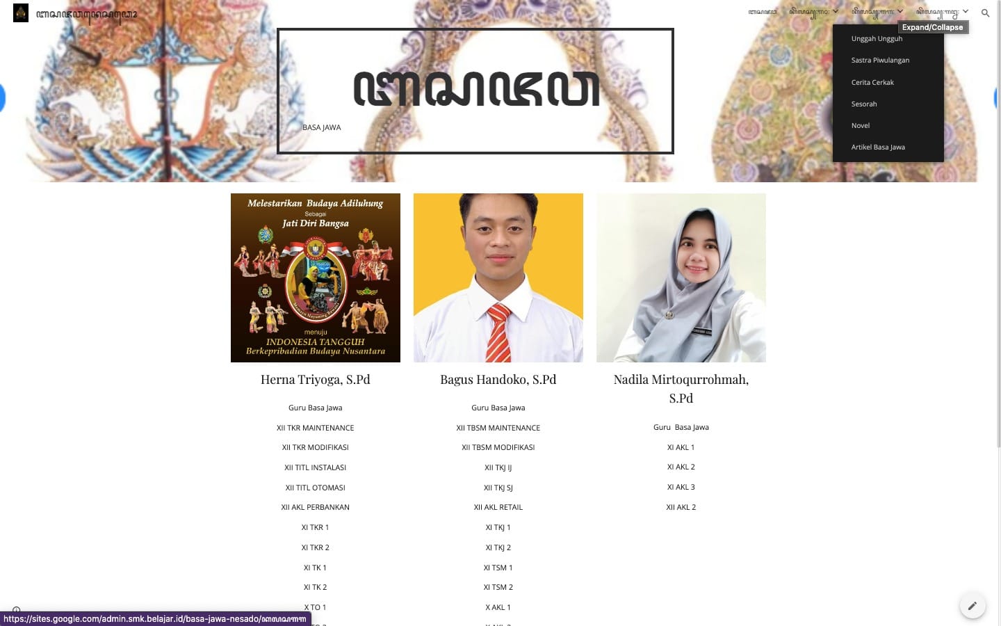 Ibu Herna Triyoga atau Bu Yoga, Guru Seni Budaya SMK Negeri 1 Blado Kabupaten Batang Provinsi Jawa Tengah, bersama Bapak Bagus Handoko, S.Pd, dan Ibu Nadila Mirqoturrohmah, S.Pd. Melaksanakan inovasi dalam pembelajaran Basa Jawa dengan membuat media pembelajaran menggunakan G-site demi memudahkan akses siswa dalam mempelajari materi pada Tahun Ajaran 2024-2025 ini.