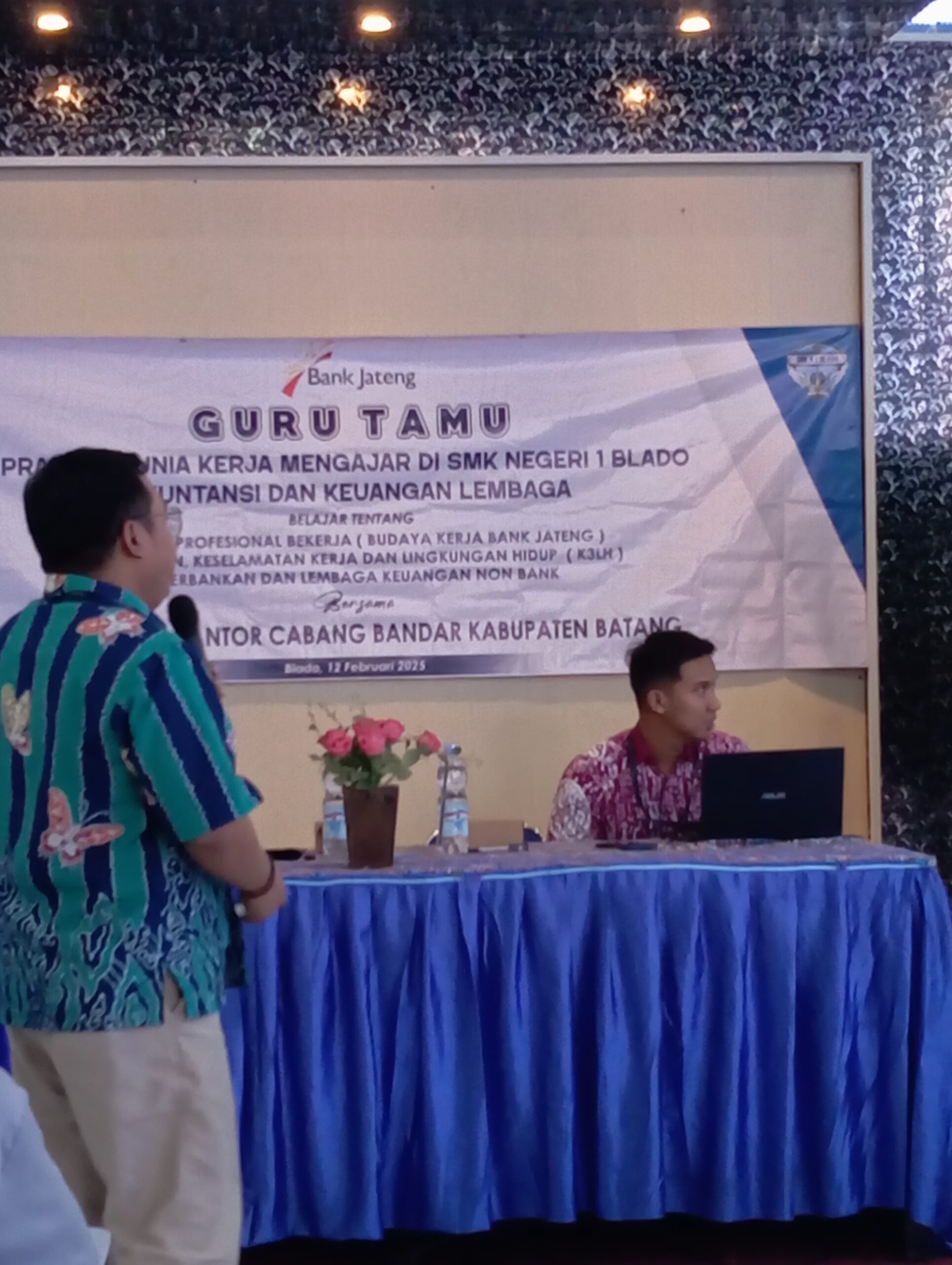 Rabu, 12 Februari 2025, Di dunia pendidikan kejuruan, keterlibatan industri sangat penting untuk memberikan wawasan nyata kepada siswa. Dalam rangka meningkatkan kompetensi dan pengetahuan siswa-siswi SMK jurusan Akuntansi & Keuangan Lembaga, SMK Negeri 1 Blado mengundang guru tamu dari Bank Jateng yaitu Bapak Wahyu Toto Waskito selaku Pemimpin Bank Jateng Cabang Pembantu Bandar, Kabupaten Batang. Kegiatan ini bertujuan untuk membekali siswa jurusan Akuntansi dengan pengetahuan praktis di bidang perbankan dan akuntansi.