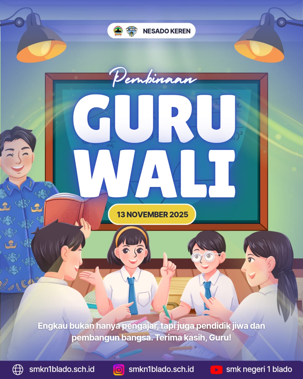 SMK N 1 BLADO atau yang dikenal sebagai “Nesado”, secara rutin mengadakan kegiatan pembinaan guru wali untuk meningkatkan peran dan kinerja mereka dalam mendampingi peserta didik. Program ini merupakan bagian dari inisiatif sekolah untuk mengoptimalkan bimbingan akademik, pengembangan karakter, dan komunikasi dengan orang tua siswa.