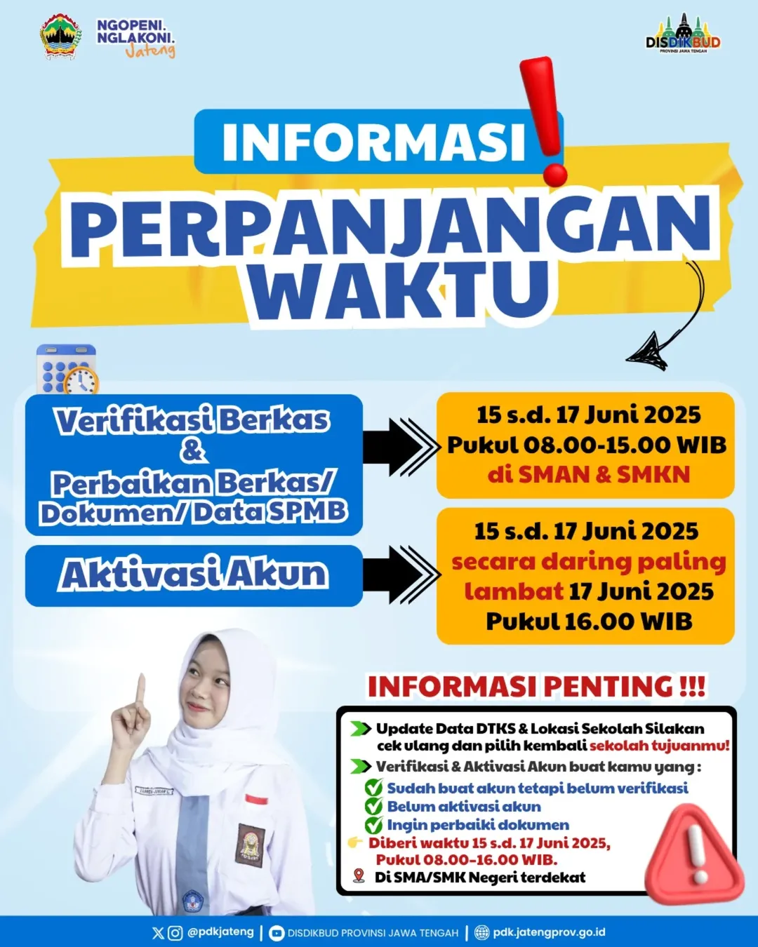 Hai adik-adik SMP/MTs disekitar SMKN 1 Blado, ada informasi penting nih. Saat ini ada perpanjangan waktu untuk verifikasi berkas, perbaikan berkas dokumen/data SPMB dan Aktivasi akun ya. Ayo catat tanggalnya, jangan sampai ketinggalan kesempatan ini. Segera datang ke SMA/SMK Negeri tempat kalian melakukan verifikasi berkas, untuk kemudian dibantu oleh operator yang memverifikasi berkas kalian ya, pastinya berkasnya harus dibawa lengkap ya. Jangan lupa cek jurnal SPMB untuk melihat peringkat pada jalur dan jurusan yang kalian pilih. Bisa juga untuk melihat sekolahan lain kok, jadi kalian bisa melihat berapa nilai terendah dan tertinggi yang masuk pada peringkat seleksi. Untuk melihat jurnal bisa juga klik disini.