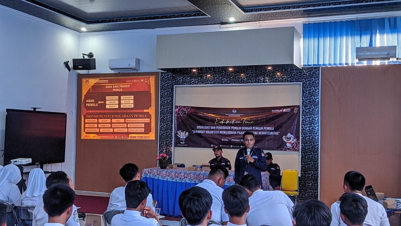 Senin, 28 Oktober 2024. Panitia Pemilihan Kecamatan, Kecamatan Blado melakukan sosialisasi ke SMK Negeri 1 Blado. M. Fuad Nur Afifi selaku Ketua PPK menyampaikan terimakasih kepada pihak SMK Negeri 1 Blado dan sejumlah 90an siswa-siswa SMK Negeri 1 Blado yang telah mengikuti kegiatan sosialisasi ini serta berharap kepada pemilih pemula untuk menggunakan hak pilihnya dengan bijak.