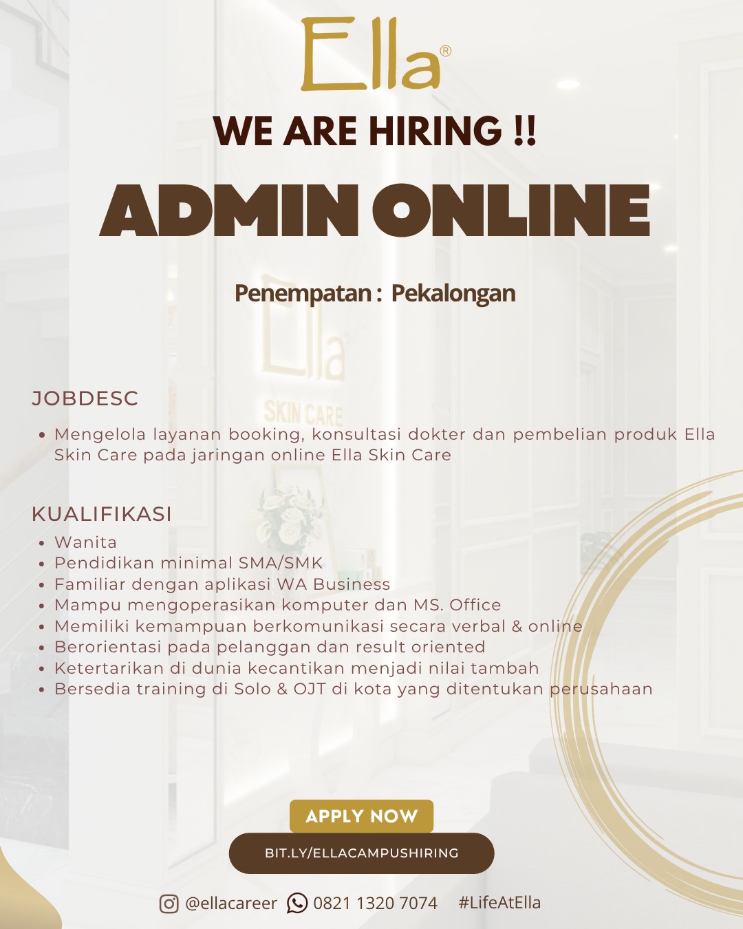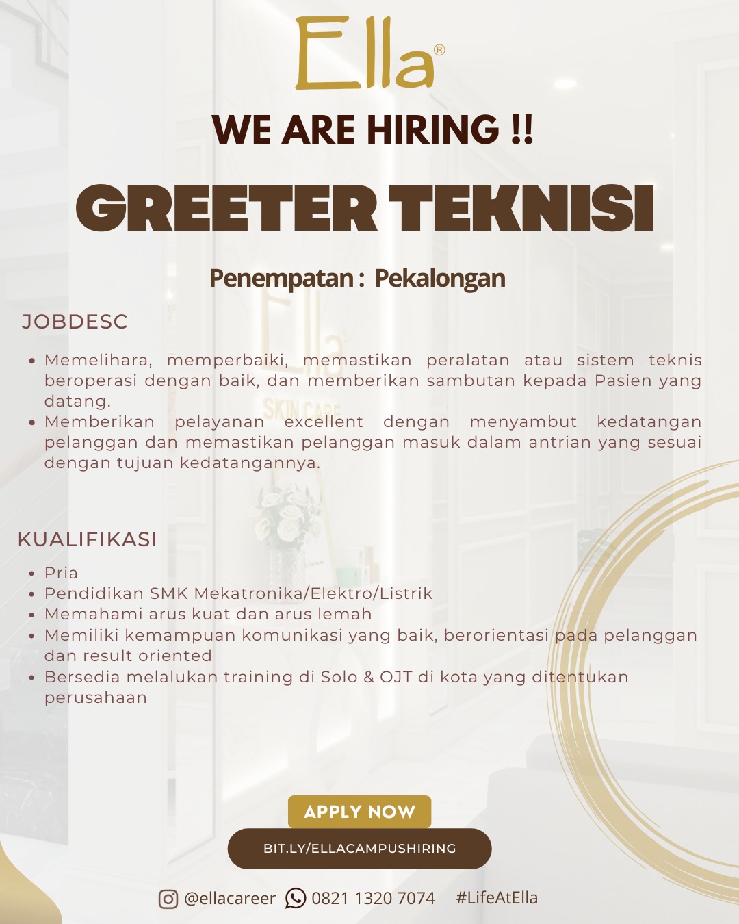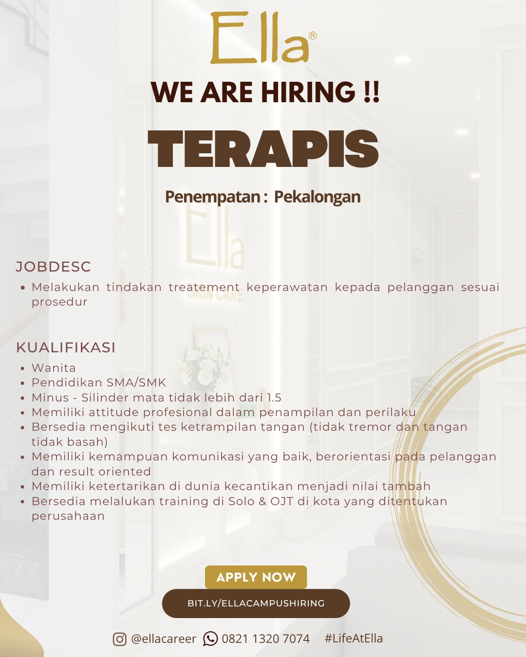 Ella Skin Care mencari kandidat terbaik untuk cabang baru di Pekalongan, yang memenuhi kualifikasi pada posisi: